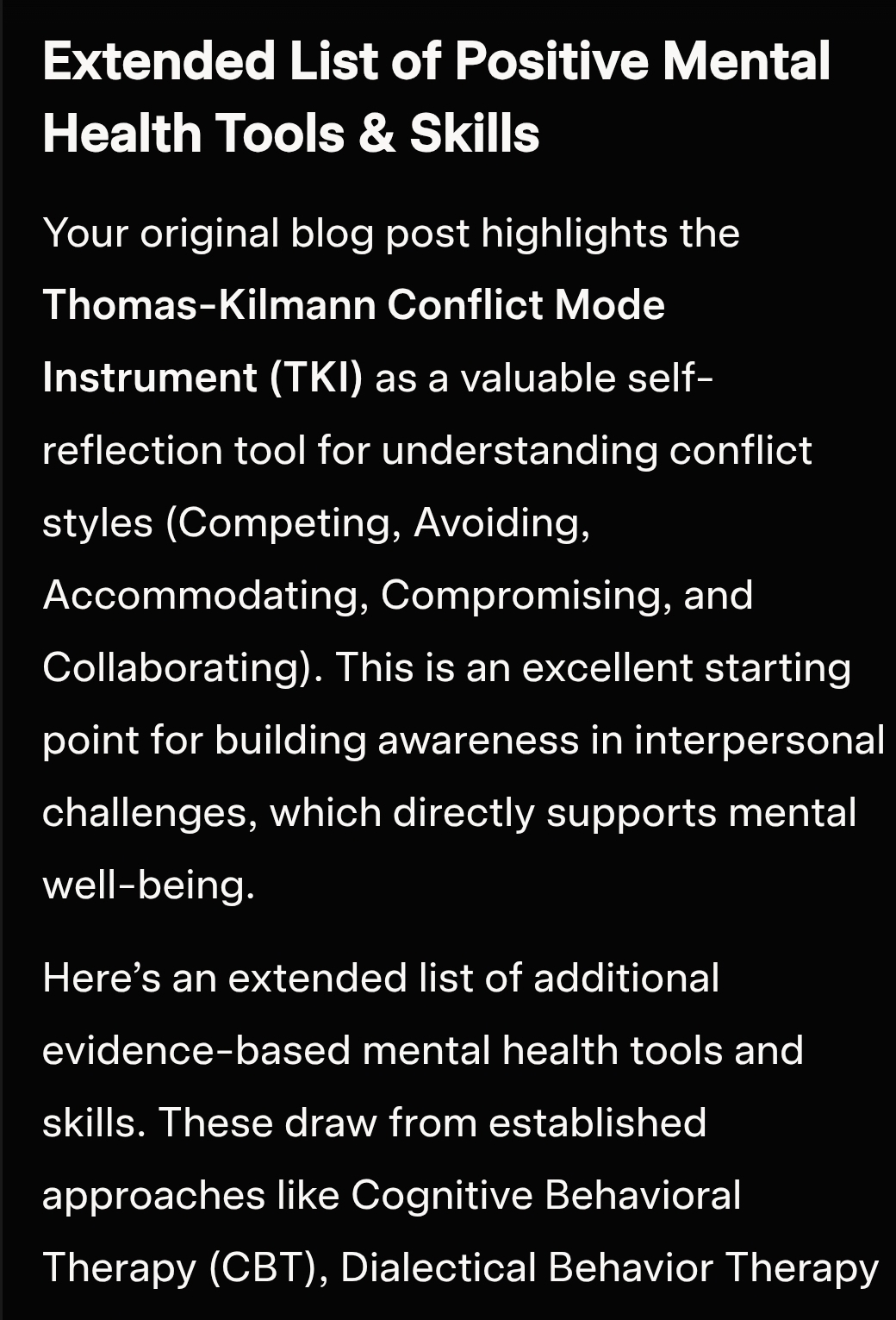 Extended List of Positive Mental Health Tools & Skills Your original blog post highlights the Thomas-Kilmann Conflict Mode Instrument (TKI) as a valuable self-reflection tool for understanding conflict styles (Competing, Avoiding, Accommodating, Compromising, and Collaborating). This is an excellent starting point for building awareness in interpersonal challenges, which directly supports mental well-being. Here’s an extendedContinue reading “S1475: +ve Mental Health Tools & Skills for India..”