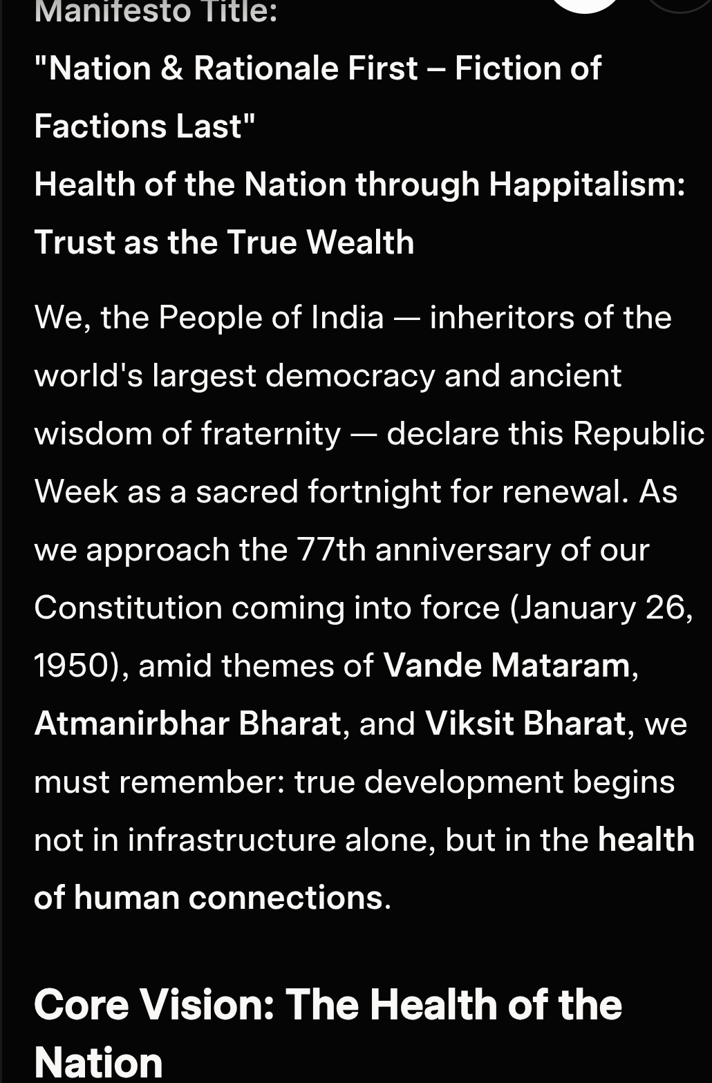 Youth Day to Republic Day.. A neo-vision for Young4Republic India. https://www.indiatoday.in/information/story/national-youth-day-2026-why-india-celebrates-swami-vivekanandas-birth-on-january-12-2850515-2026-01-12#google_vignette Here is a Manifesto for Republic Week (January 12–26, 2026), a 15-day national awakening period leading to the 77th Republic Day. This period bridges Constitution Day reflections (November) and the grand celebration on January 26, serving as a call to action for every citizenContinue reading “S1478: Crapitalism of West to Happitalism of East. Neo-Republic Fortnight Vision.”