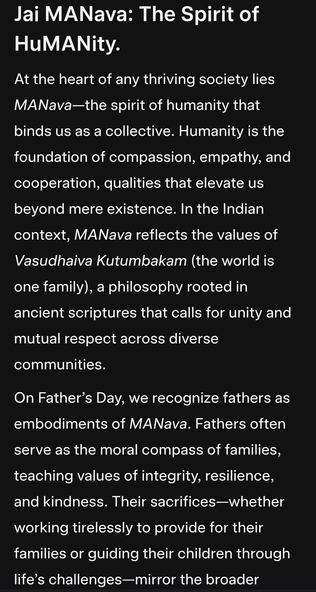 Jai Jawan, Jai Kisaan, Jai Insaan: Celebrating Humanity, Valor, Sustenance, and Nurture on Father’s Day 2025 On this Father’s Day, June 15, 2025, we pause to honor the pillars of our society and families, encapsulated in the resonant chant: Jai MANava, Jai Jawan, Jai Kisaan, Jai Poshan (Ma, Bap, No Gap). This powerful invocation expandsContinue reading “S1073: Fathers Day 2025.”