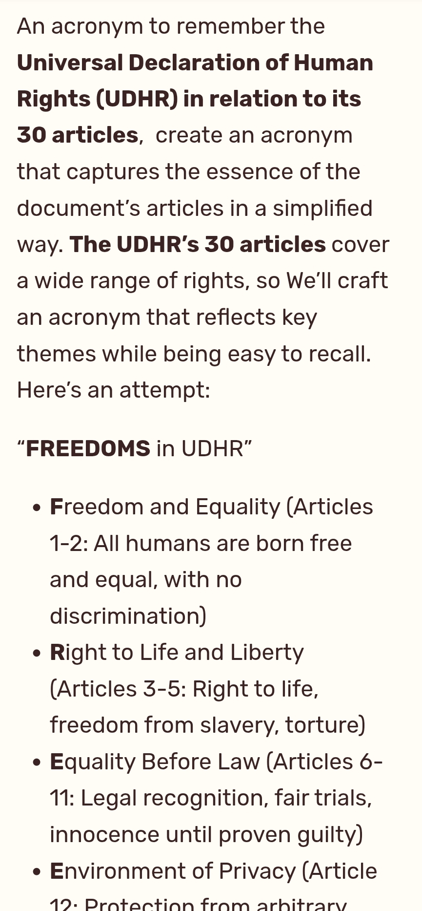 An acronym to remember the Universal Declaration of Human Rights (UDHR) in relation to its 30 articles, create an acronym that captures the essence of the document’s articles in a simplified way. The UDHR’s 30 articles cover a wide range of rights, so We’ll craft an acronym that reflects key themes while being easy toContinue reading “S1079: UDHR and 30 FREEDOMS for WE Earthlings..”