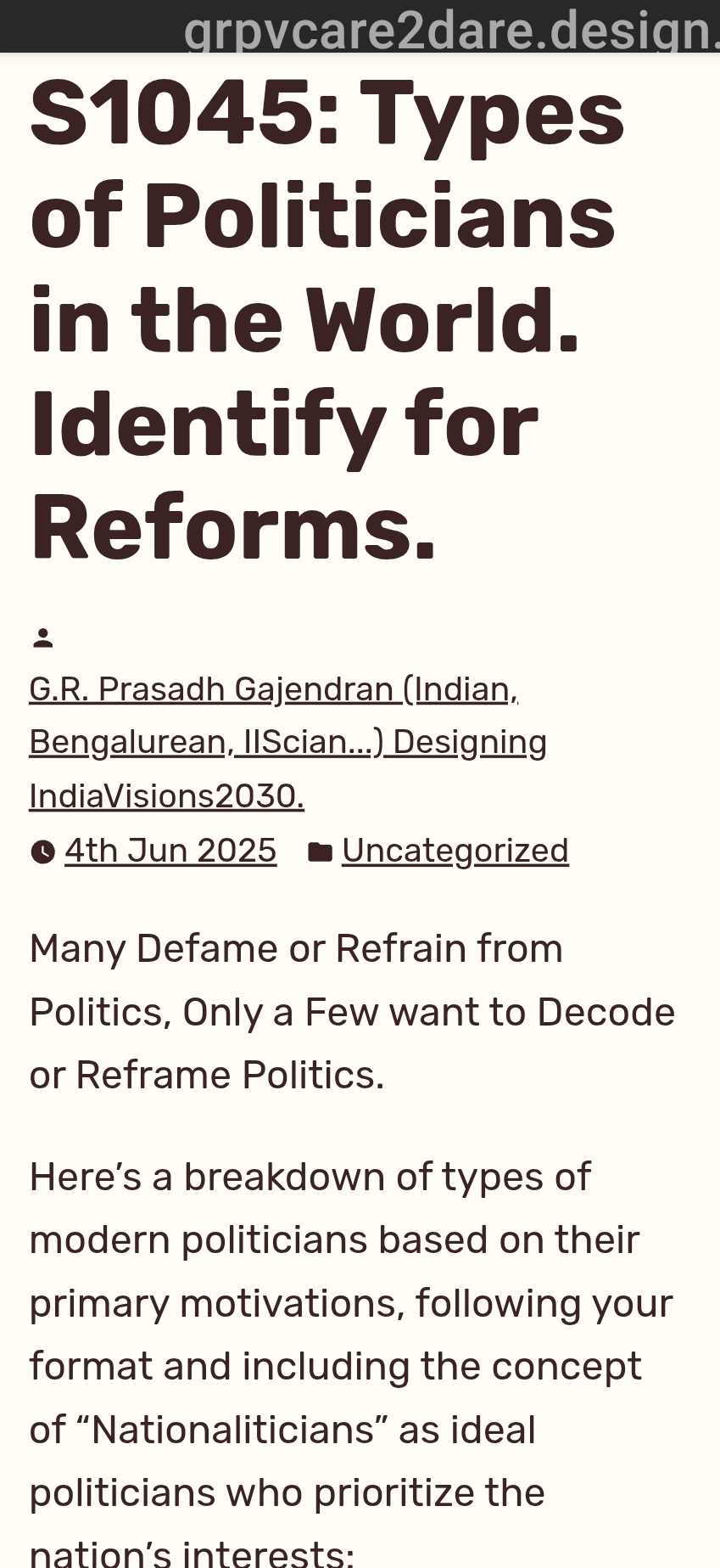 Many Citizens Defame or Refrain from Politics it makes or keeps society bitter, Only a Few want to Decode or Reframe Politics and make systems better. Here’s a breakdown of types of modern politicians based on their primary motivations, following your format and including the concept of “Nationaliticians” as ideal politicians who prioritize the nation’sContinue reading “S1045: Types of Politicians in the World. Identify for Reforms.”