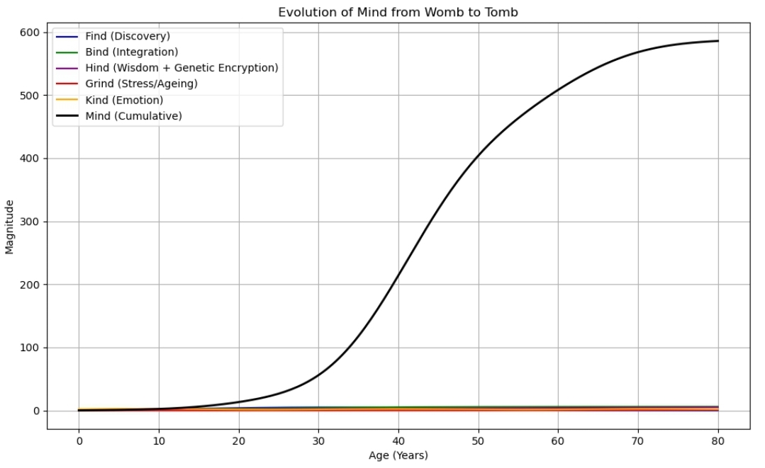 MIND= Memes In Neural Networks. (GRP’ Creation). Evolution of Mind from Womb to Tomb. What’s our Mind. An Equation for the Mind. The final Mind equation, incorporating Find (discovery), Bind (integration), Hind (wisdom with genetic encryption), Grind (stress, ageing, rubbing factors), Kind (emotional/hormonal factors), and Rind (spiritual/godly cosmic factor), as derived from the chart modelContinue reading “S1026: MIND =Find × Bind. Consciousness.”