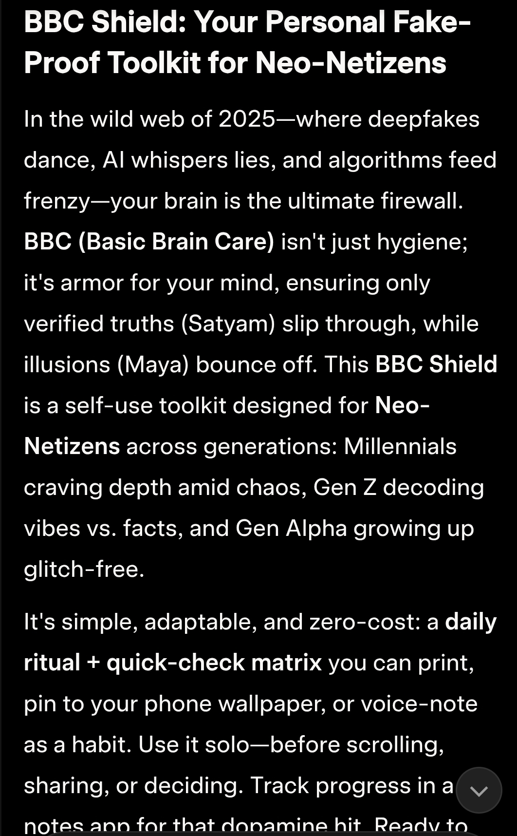 Protect UR Brain from Illusions of MAYA.. (Manipulation Arrogance, Yes weMen & Anti-Rationals) BBC Shield: Your Personal Fake-Proof Toolkit for Neo-Netizens In the wild web of 2025—where deepfakes dance, AI whispers lies, and algorithms feed frenzy—your brain is the ultimate firewall. BBC (Basic Brain Care) isn’t just hygiene; it’s armor for your mind, ensuring onlyContinue reading “S1452: BBC Shield: Basic Brain CyberCare.”