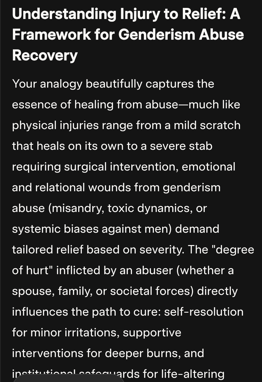 Understanding Injury to Relief: A Framework for Genderism Abuse Recovery Your analogy beautifully captures the essence of healing from abuse—much like physical injuries range from a mild scratch that heals on its own to a severe stab requiring surgical intervention, emotional and relational wounds from genderism abuse (misandry, toxic dynamics, or systemic biases against men)Continue reading “S1414: From Injury to Relief, From Victim to Victor..”