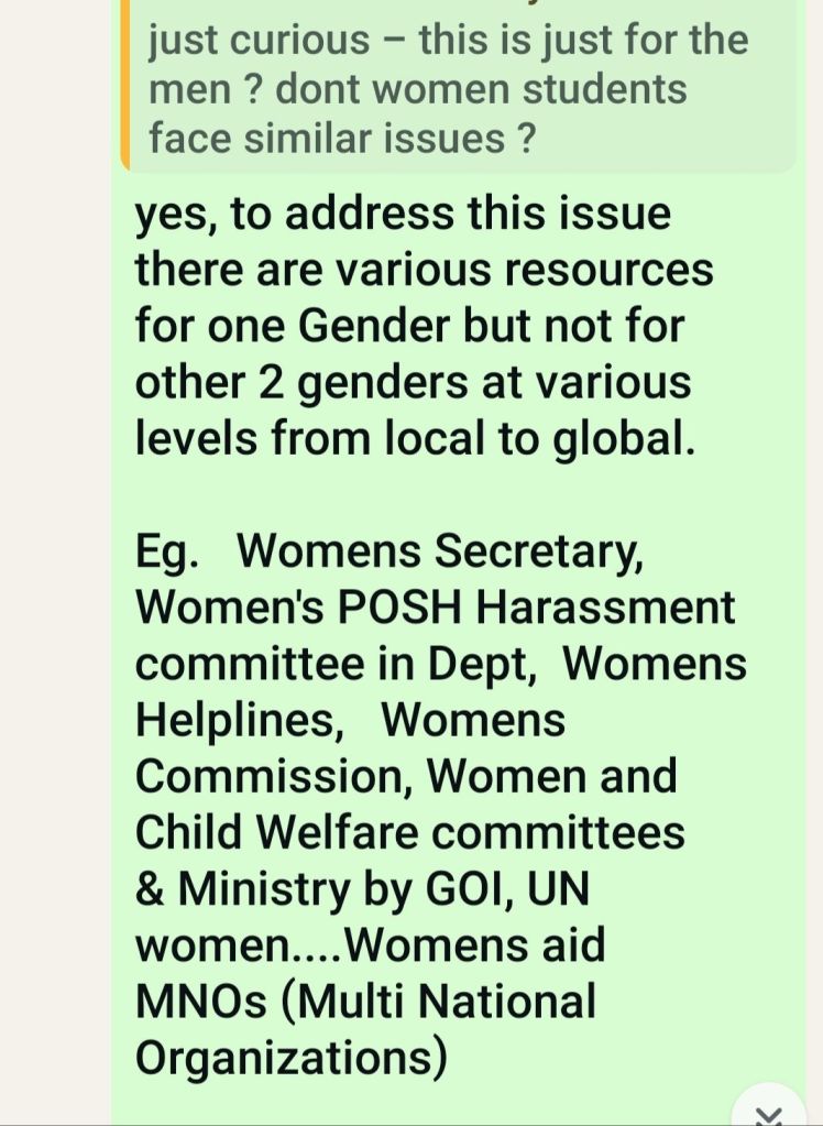 Answer to above Question by an IIScian: yes, to address this issue there are various resources for one Gender but not for other 2 genders at various levels from local to global.