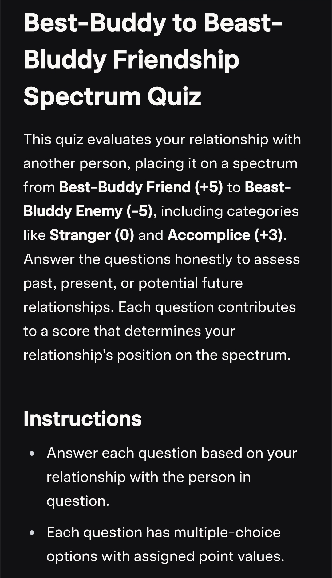 - Scoring structure influenced by quiz design principles from online platforms like GotoQuiz, ensuring clear, testable metrics for relationship evaluation.
