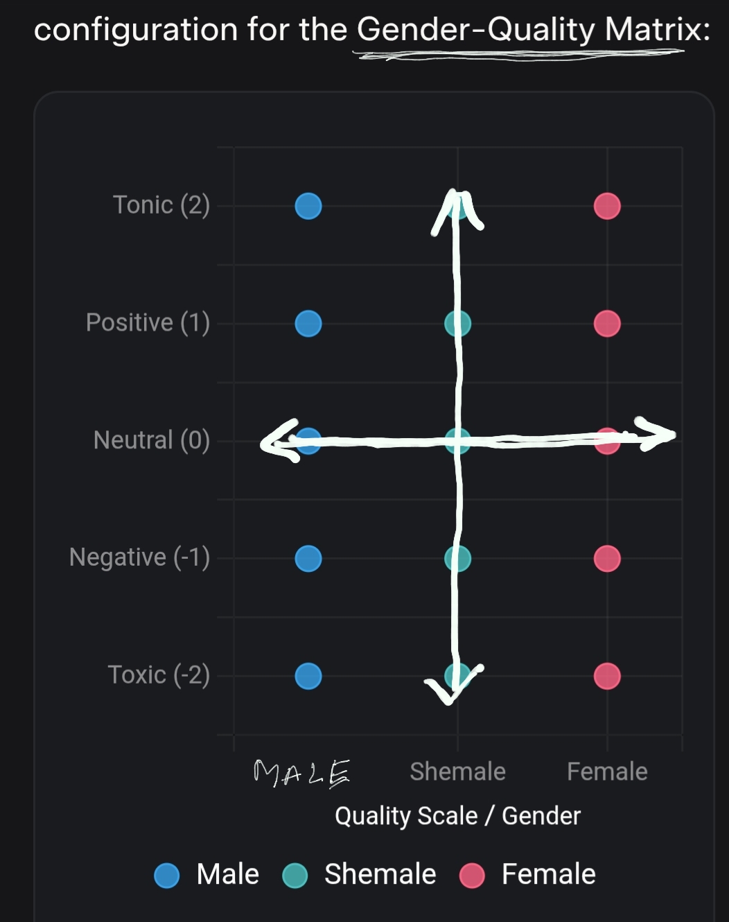 The Gender-Quality Matrix is a conceptual framework that maps gender expressions (Male, Mixd’Gender, Female) against a spectrum of qualities, ranging from highly constructive (Tonic) to highly destructive (Toxic). Visualized as a scatter chart, this matrix provides a clear and intuitive way to understand how different gender expressions manifest across five quality scales: Tonic (+2), Positive (+1), Neutral (0), Negative (-1), and Toxic (-2). In this blog, we’ll explore the matrix, its structure, and the qualities associated with each gender-scale combination, with a focus on Tonic Masculinity in the top-left quadrant and Toxic Femininity in the bottom-right quadrant.