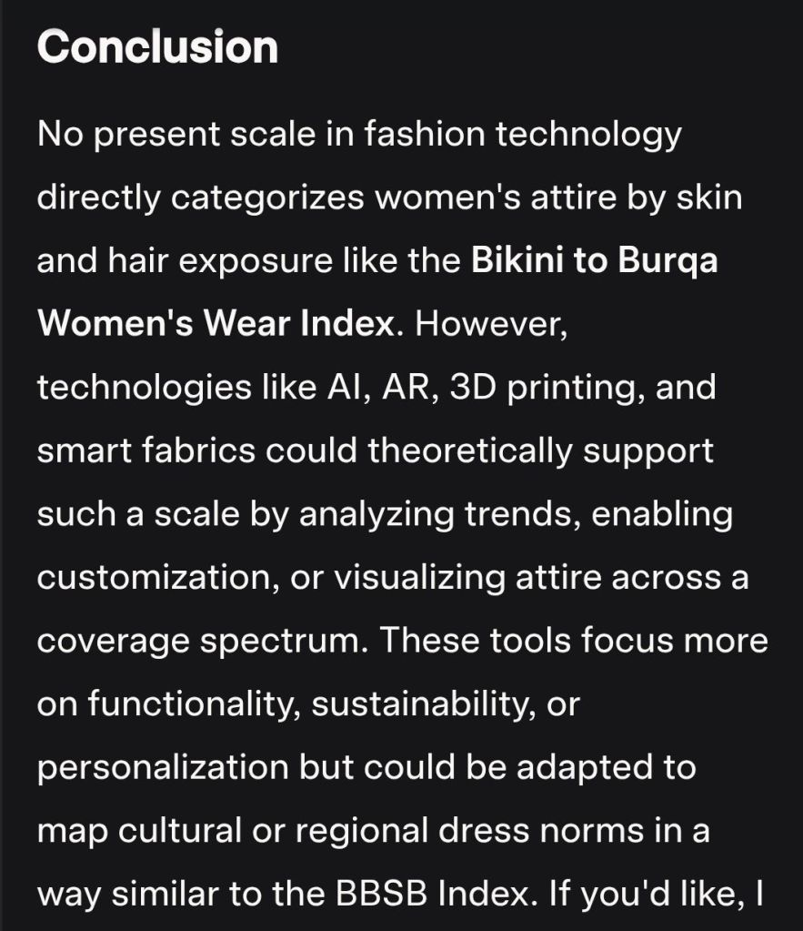 The Bikini to Burqa Womens Wear Index (B2BWW Index) is a conceptual framework to categorize dress codes for women based on the degree of skin and hair exposure. It places attire on a spectrum from minimal coverage to maximum coverage, reflecting cultural, social, or regional dressing norms. This index can be used to broadly characterize the predominant dress styles for women in a city or nation, acknowledging that individual choices vary widely.