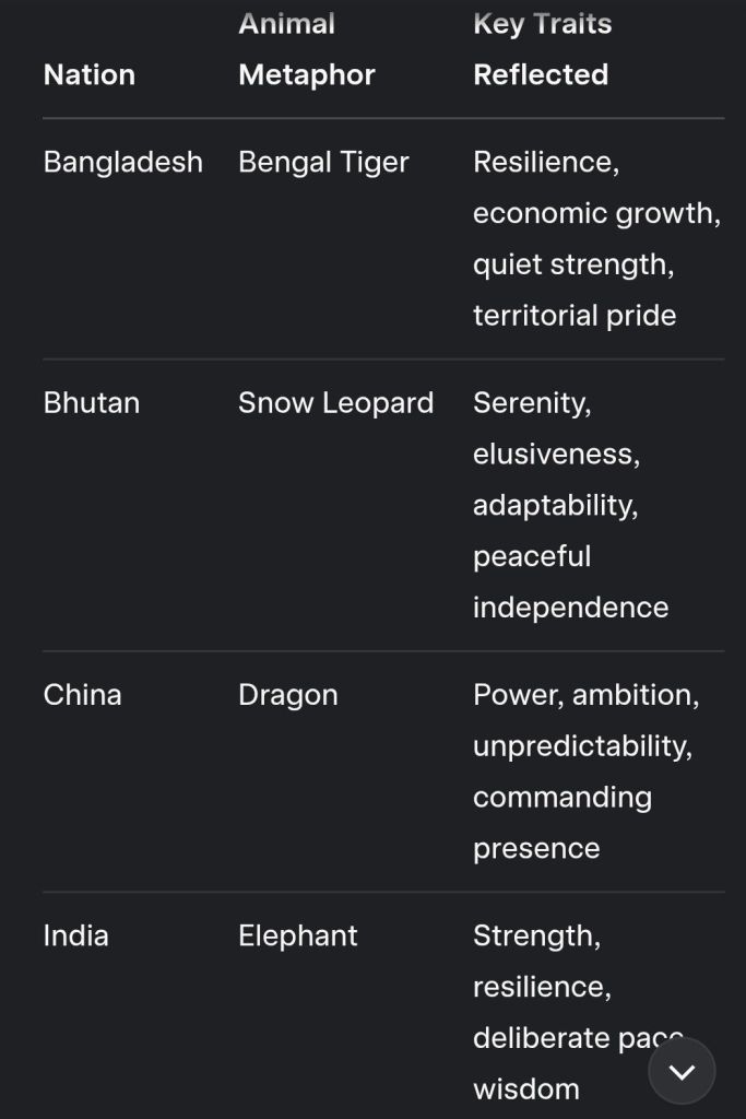 These metaphors are symbolic and risk oversimplification. Each nation’s “character” is shaped by history, geography, and policy, not just animal traits. For example, Bangladesh’s “tiger” also reflects its economic roar, while Myanmar’s “buffalo” hides its cultural depth. If you’d like a deeper focus on any nation or specific traits (e.g., military, economy), let me know!