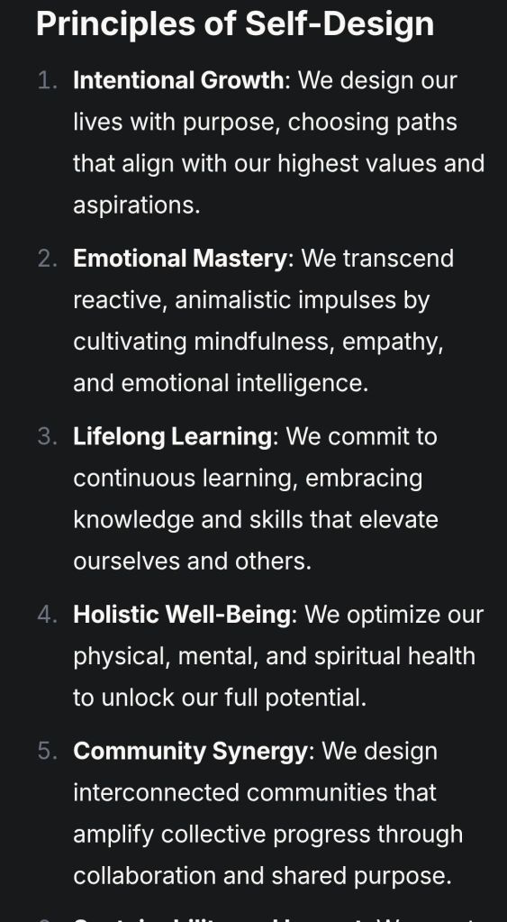 • Daily Routines/Rituals: Personal practices to cultivate self-betterment, emotional mastery, and resilience, aligned with tenets like Intentional Self-Design and Holistic Resilience.