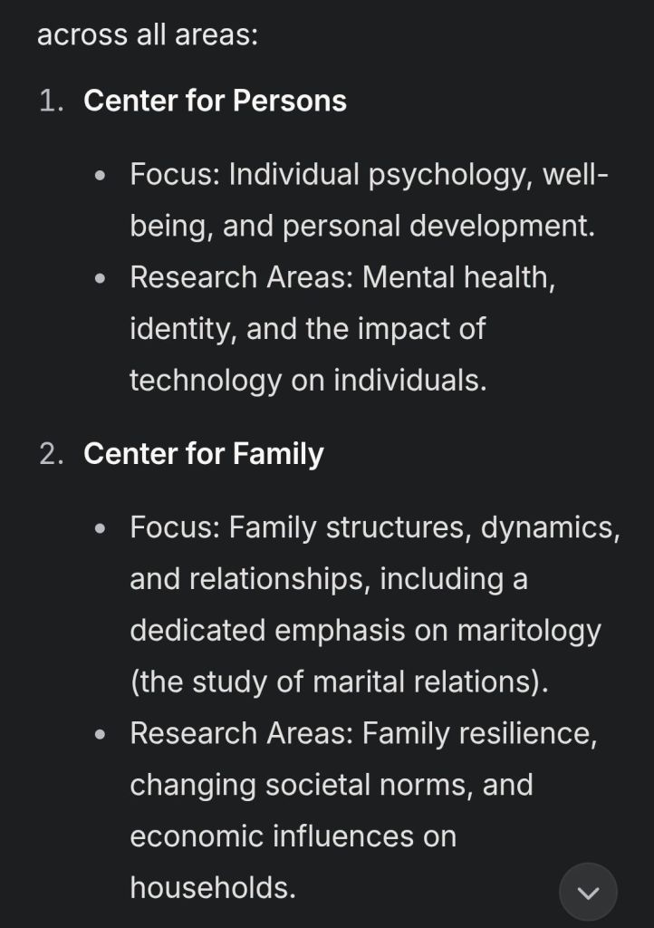 – Focus: Family structures, dynamics, and relationships, including a dedicated emphasis on maritology (the study of marital relations).