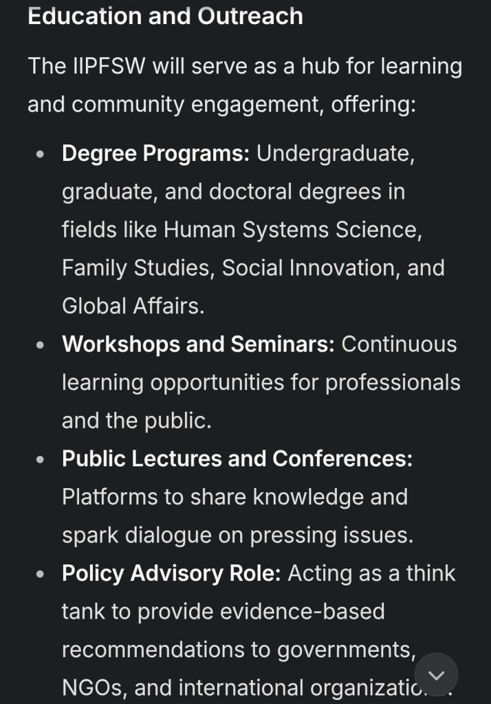 The IIPFSW aspires to be a global leader in understanding and enhancing the interconnected systems of human life. Our **vision** is a world where individuals, families, and societies thrive in harmony, supported by informed policies and sustainable practices. Our **mission** includes:
