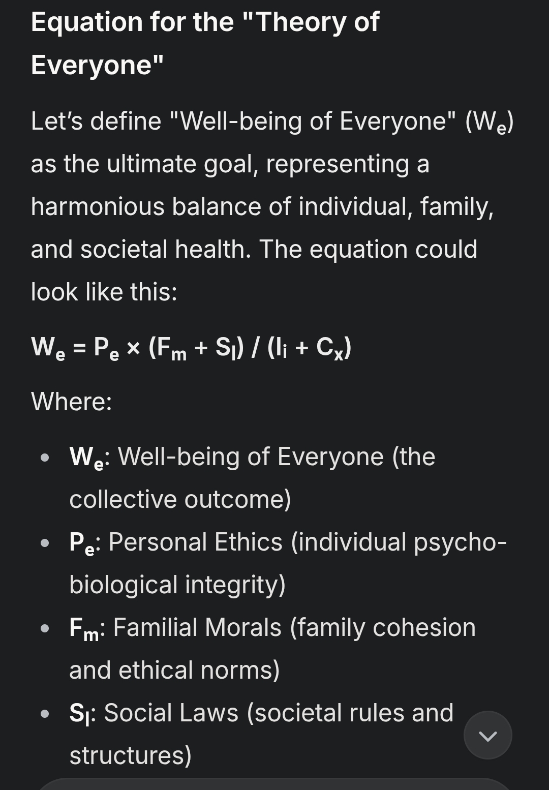 This “Theory of Everyone” isn’t a rigid formula but a heuristic to guide holistic well-being. It suggests that personal integrity, family unity, and societal structure must co-evolve, with ignorance and conflict as the key barriers. What do you think—any factors you’d tweak or add?