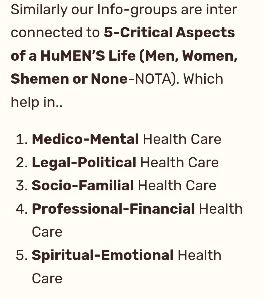 Similarly our Info-groups are inter connected to 5-Critical Aspects of a HuMEN’S Life (Men, Women, Shemen or None-NOTA). Which help in..