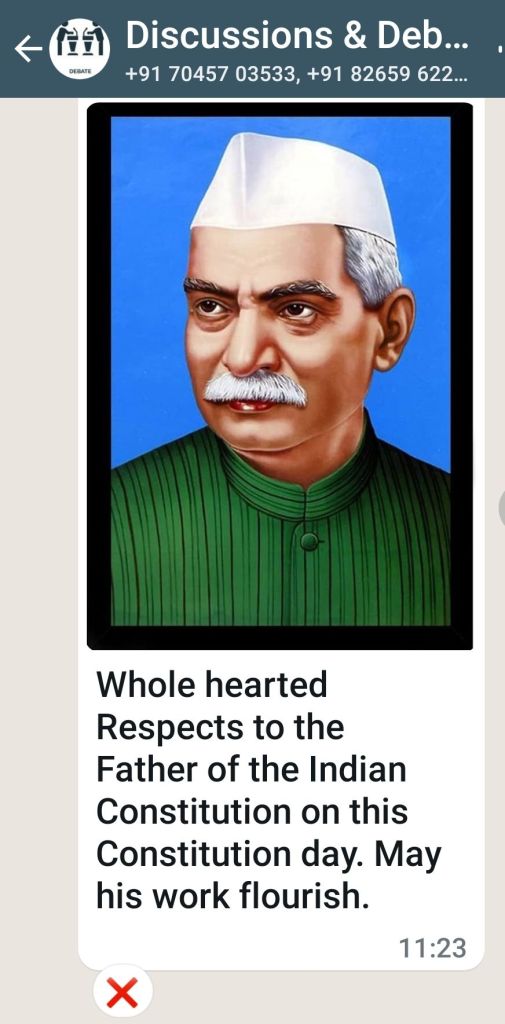 +91 98697 78529: Everything is correct. [26/11, 13:52] G.R.P )= G.R. PrasaHd =Grit+ ReaSon+ Peers) SatvyamEvaJayatem.: proof? [26/11, 13:52] +91 98697 78529: Sir what is wrong here? [26/11, 13:52] G.R.P )= G.R. PrasaHd =Grit+ ReaSon+ Peers) SatvyamEvaJayatem.: proof is ur claim that its right? [26/11, 13:53] G.R.P )= G.R. PrasaHd =Grit+ ReaSon+ Peers) SatvyamEvaJayatem.: This is claim photo is of Father of Constitution, plz proove [26/11, 13:59] +91 98697 78529: Sir ab usme prove kya karna hai? Maths ki equation to hai nahi. Simple fact. Although the title of father is not bestowed by any authority just like Gandhi was also not father of nation. [26/11, 14:00] G.R.P )= G.R. PrasaHd =Grit+ ReaSon+ Peers) SatvyamEvaJayatem.: rhetoric is not proof.. can give source of this information.. as all sources proove someone else as father of Constitution.. This above is a fabricated fake message [26/11, 14:01] +91 98697 78529: Whom does all sources prove? [26/11, 14:01] G.R.P )= G.R. PrasaHd =Grit+ ReaSon+ Peers) SatvyamEvaJayatem.: not the above photo its another photo and personality.. https://duckduckgo.com/?q=father+of+indian+constitution&ia=web [26/11, 14:02] G.R.P )= G.R. PrasaHd =Grit+ ReaSon+ Peers) SatvyamEvaJayatem.: This is false information [26/11, 14:05] G.R.P )= G.R. PrasaHd =Grit+ ReaSon+ Peers) SatvyamEvaJayatem.: This is True Information with proof. [26/11, 14:07] +91 98697 78529: The person who you named was heading the drafting committee which was a sub committee of the constituent assembly which was formed to create the constitution which was headed by the great man whose photo I have posted. [26/11, 14:07] G.R.P )= G.R. PrasaHd =Grit+ ReaSon+ Peers) SatvyamEvaJayatem.: Requesting Proof on who the Father of Constitution is?..Not rhetoric expected [26/11, 14:09] +91 98697 78529: Read this. Already told you [26/11, 14:09] G.R.P )= G.R. PrasaHd =Grit+ ReaSon+ Peers) SatvyamEvaJayatem.: misdirection.. i dint name anyone.. the source is naming [26/11, 14:09] +91 98697 78529: Ok your source [26/11, 14:09] G.R.P )= G.R. PrasaHd =Grit+ ReaSon+ Peers) SatvyamEvaJayatem.: its just opinion.. not verifiable fact [26/11, 14:09] +91 98697 78529: Doesn’t need verification [26/11, 14:10] G.R.P )= G.R. PrasaHd =Grit+ ReaSon+ Peers) SatvyamEvaJayatem.: already given links sources above. if really intellectual honest challenger side claimant side to provide sources [26/11, 14:11] +91 98697 78529: Dona Google search you are searching on duck duck [26/11, 14:13] G.R.P )= G.R. PrasaHd =Grit+ ReaSon+ Peers) SatvyamEvaJayatem.: Do challengers have better proof and source. Do present it ? wondering where such false information is coming from? [26/11, 14:15] G.R.P )= G.R. PrasaHd =Grit+ ReaSon+ Peers) SatvyamEvaJayatem.: Source1 [26/11, 14:17] G.R.P )= G.R. PrasaHd =Grit+ ReaSon+ Peers) SatvyamEvaJayatem.: source2… Not Right photo proofs (2) & Claimant of photo Proofs(0) [26/11, 14:22] G.R.P )= G.R. PrasaHd =Grit+ ReaSon+ Peers) SatvyamEvaJayatem.: For more indepth study of Constitution can Join Study Circle..