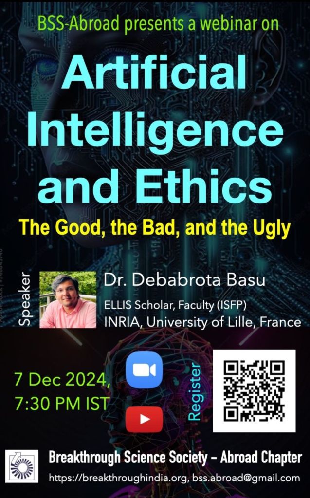Dear friend, Breakthrough Science Society – Abroad Chapter is going to organize a webinar on ‘Artificial Intelligence and Ethics: The Good, the Bad, and the Ugly’ on Dec 7 (Saturday) at 7:30 PM IST. In this webinar, we’ll explore the profound impact AI is having on our world—both positive and negative—and examine the ethical dilemmas it presents. From life-changing innovations to the potential dangers of bias, surveillance, and job displacement, AI is reshaping society in ways we are only beginning to understand. Our speaker will delve into the promises and pitfalls of AI. Join us as we explore the ethical questions that will shape the future of AI and its role in our lives.