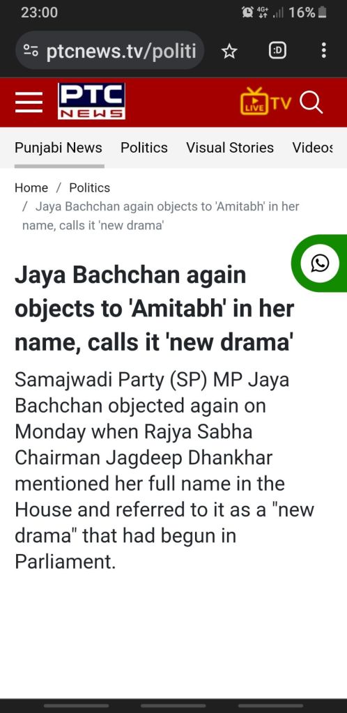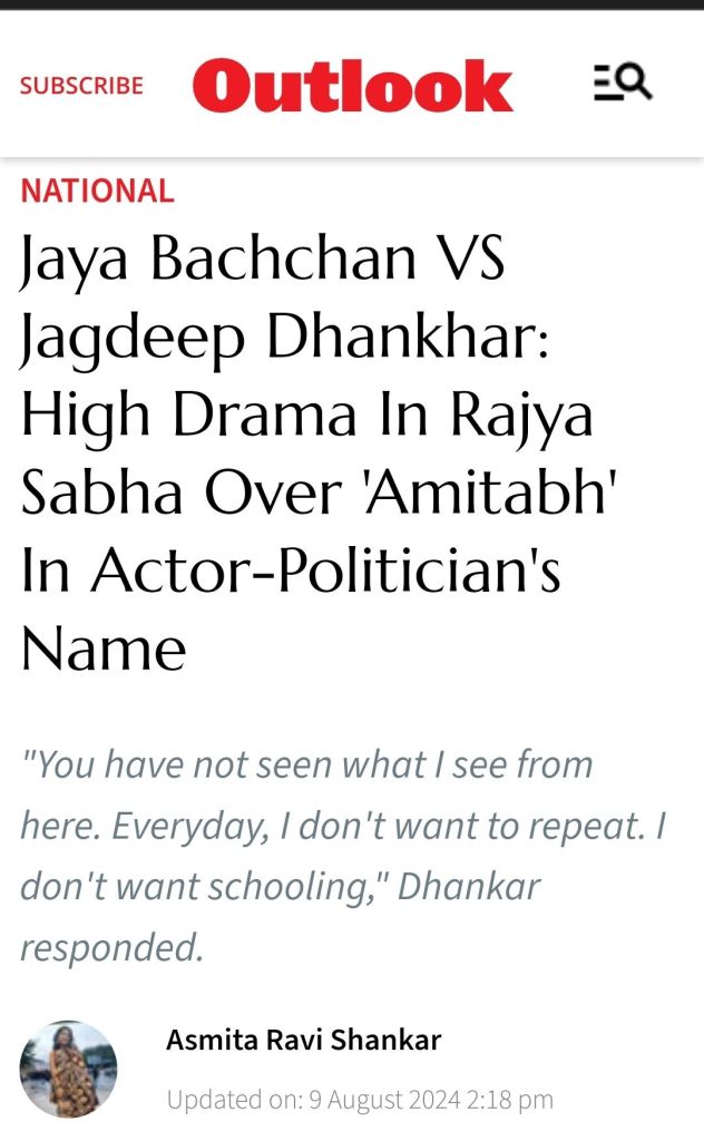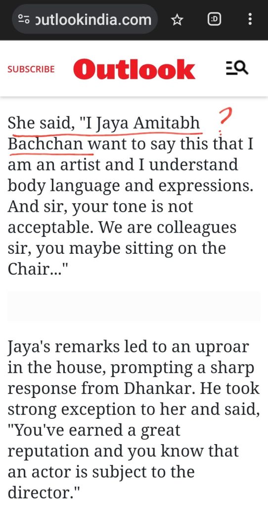 Step 3. Jayabachan herself says I am “Jaya Amitabh Bachan” this triggers response in Parliament and speaker too and continues provokes ro amuse & then Points at Tone of VP.?